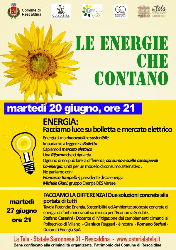 Due serate, il 20 e 27 giugno 2017, organizzate dal DES Varese, CO-energia, Gasabile, La Tela e il Comune di Rescaldina presso la sala Pietro Sanua de La Tela (Statale Saronnese 31 Rescaldina) per avere la possibilità di orientarci meglio nella confusione del mercato dell'energia elettrica e delle trasformazioni in corso che ci riguardano tutti.