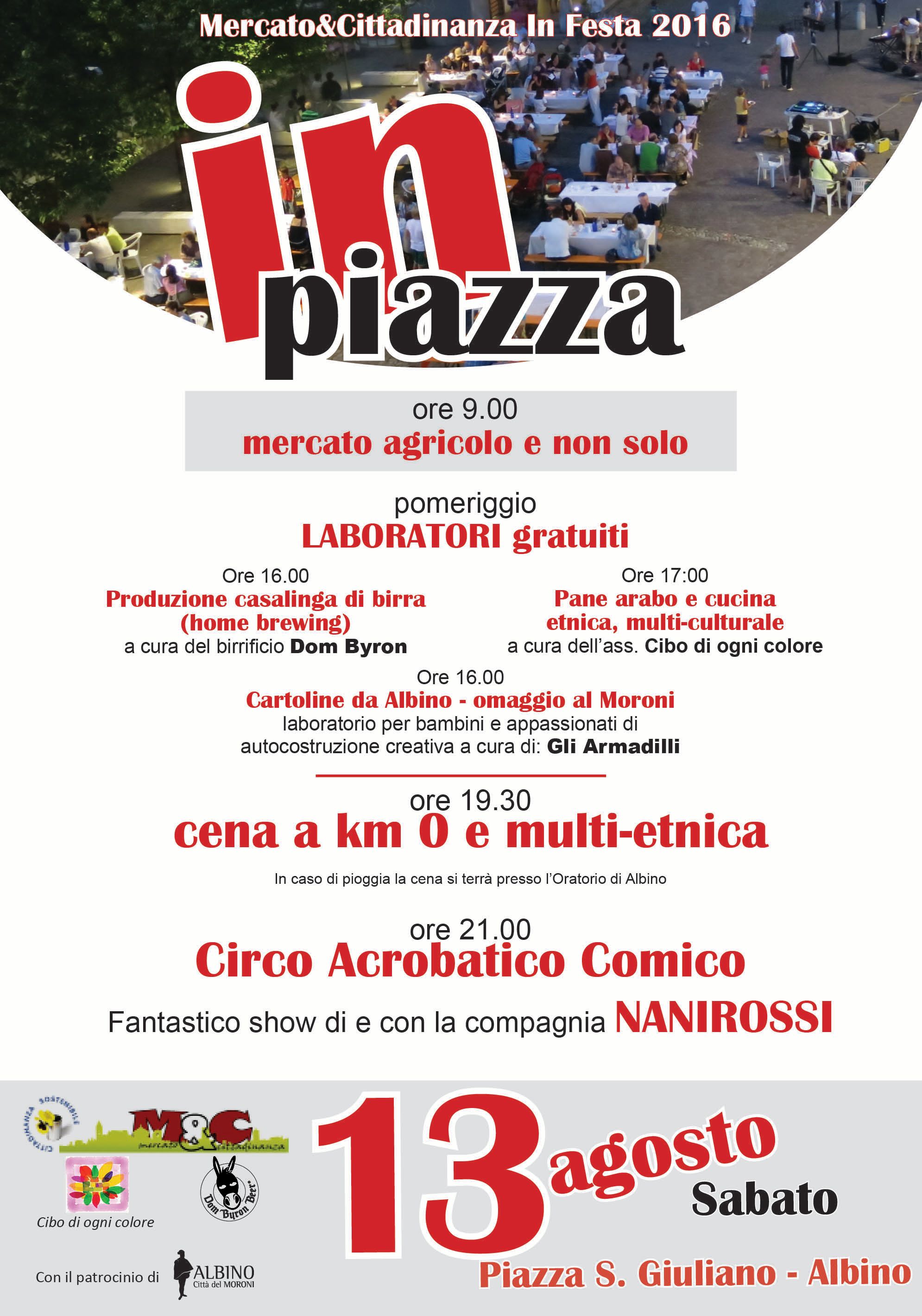 La "Festa In Piazza" prevede, oltre al solito mercato dalle 9.00 alle 12.30, ulteriori attività interessanti come ad esempio i laboratori pomeridiani di scambio di saperi, uno spettacolo di circo moderno e l’ormai tradizionale Cena a kmZero con prodotti locali, dei produttori M&C e di alcuni negozi di vicinato albinesi. Quest’anno la cena si arricchisce e diventa anche multi-etnica grazie al contributo dell’Ass. “Cibo di ogni colore”.