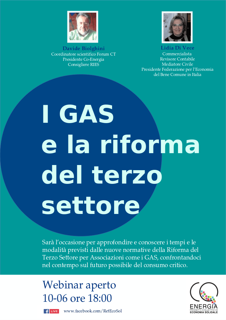 Stare “dentro” o “fuori” dal Terzo Settore: opportunità e criticità. CO-energia organizza per il 10 giugno alle ore 18.00 il webinar "I Gas e la riforma del terzo settore".