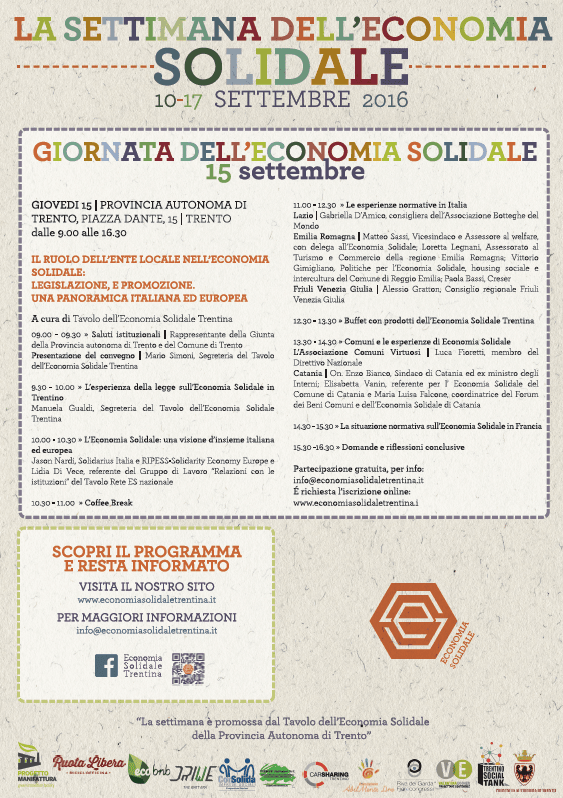 Nel pomeriggio verranno illustrate invece alcune iniziative di promozione dell’Economia Solidale attuate da alcuni Comuni italiani, per concludere con un approfondimento sulla normativa francese sempre in tema di Economia Solidale.
