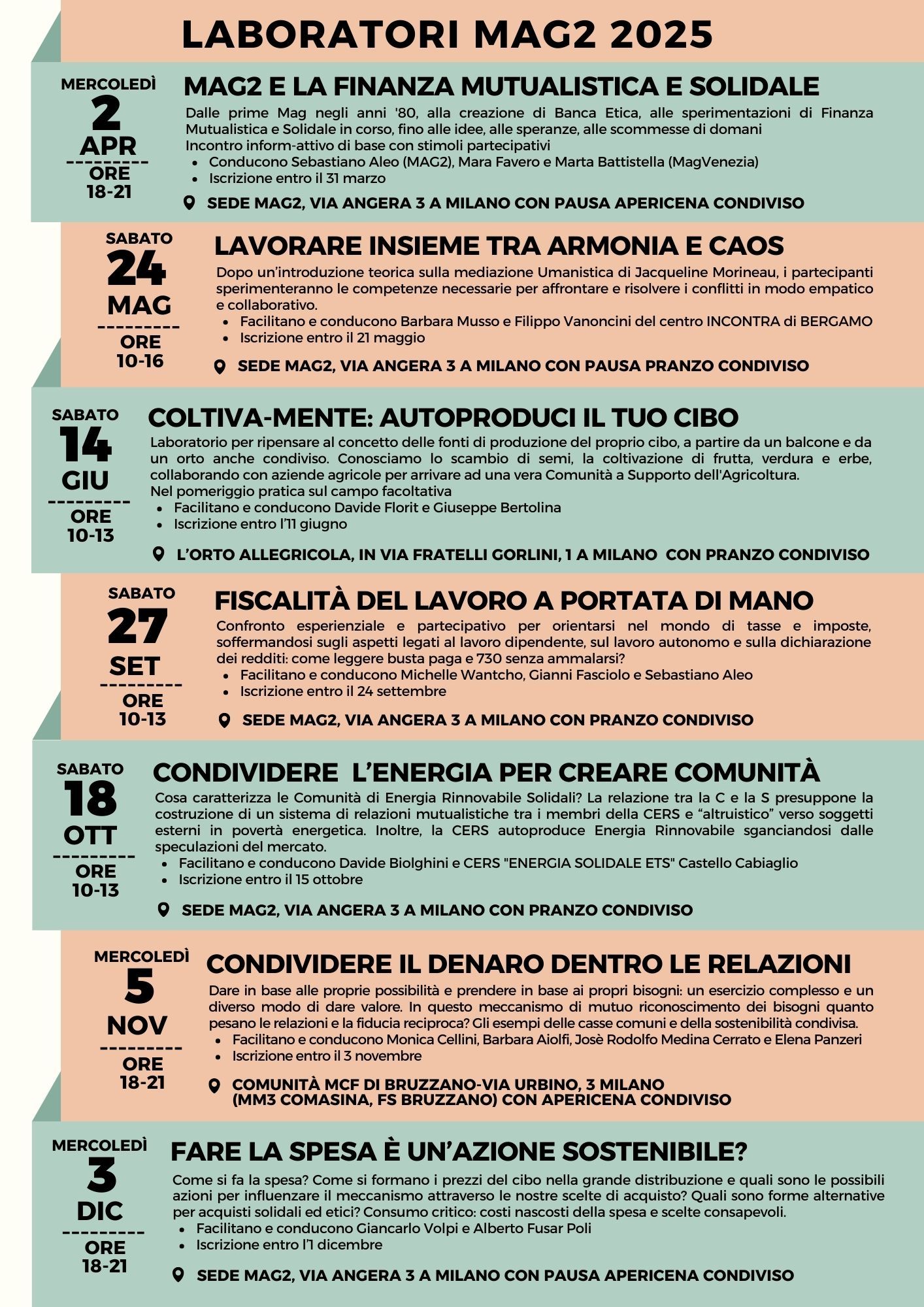 Torna la Sostenibilità Condivisa per Economie di Comunità, il progetto avviato nel 2024 e coordinato da MAG2 per concepire insieme nuove visioni per un mondo solidale e di pace basato sul rispetto delle persone e dell’ambiente. Una ricerca collettiva da attuare attraverso un percorso formativo rinnovato per l’anno in corso con l’aggiunta di più appuntamenti, l’accoglienza di nuovi relatori e il debutto di sedi inedite. Ne è scaturito un calendario di 7 laboratori da aprile a dicembre 2025 a Milano con 17 oratori a stimolare il dialogo e la riflessione su temi di rilievo, come denaro, cibo ed energia.