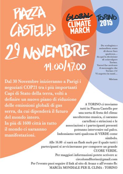 Il 29 novembre 2015 in Piazza Castello a Torino dalle 14 alle 17. Dal 30 novembre 2015 inizieranno a Parigi i negoziati COP21 tra i più importanti Capi di Stato della terra, con termine ultimo il 12 dicembre, volti a definire un nuovo piano di riduzione delle emissioni globali di gas serra, da cui dipenderà il futuro del mondo intero.